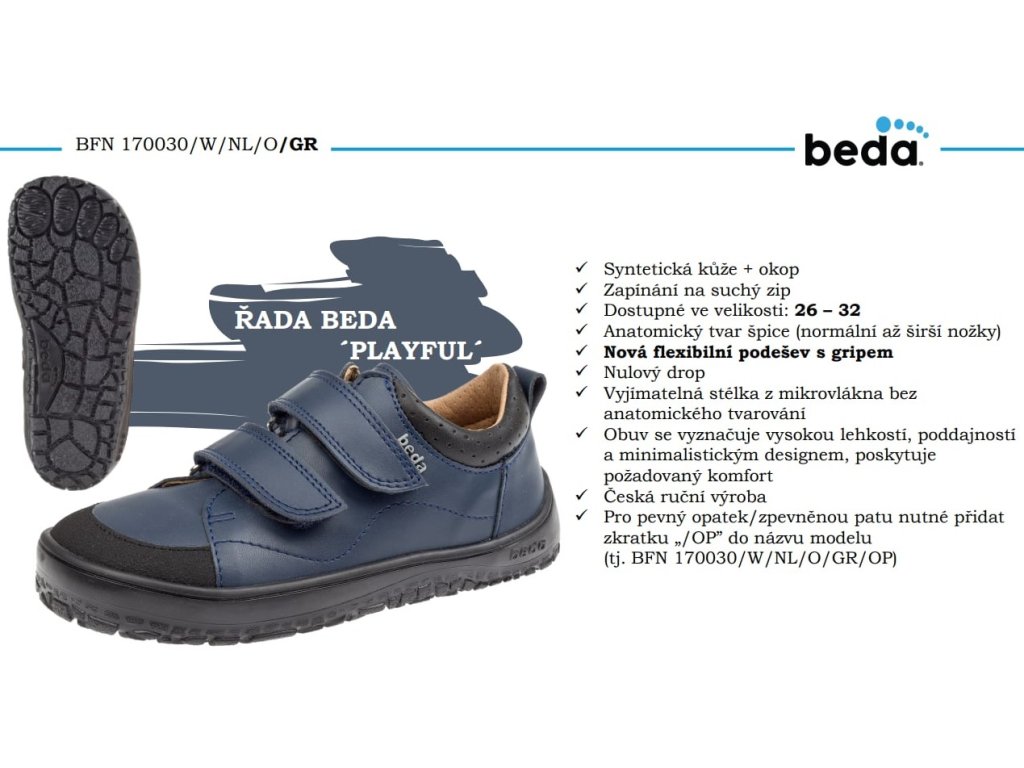 ✓ Syntetická kůže + okop✓ Zapínání na suchý zip✓ Dostupné ve velikosti: 26 – 32✓ Anatomický tvar špice (normální až širší nožky)✓ Nová flexibilní podešev s gripem✓ Nulový drop✓ Vyjímatelná stélka z mikrovlákna bezanatomického tvarování✓ Obuv se vyznačuje vysokou lehkostí, poddajnostía minimalistickým designem, poskytujepožadovaný komfort✓ Česká ruční výroba✓ Pevný opatek/zpevněná pata